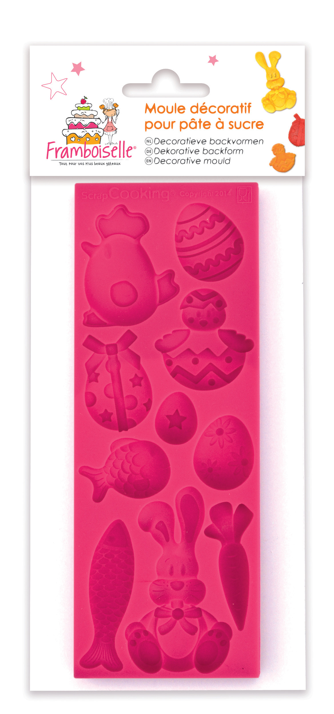 Moule en silicone permettant de réaliser des décors sur le thème de Pâques en pâte à sucre Framboiselle®. N'hésitez pas à mettre du sucre glace dans les cavités du moule, cela aidera au démoulage.