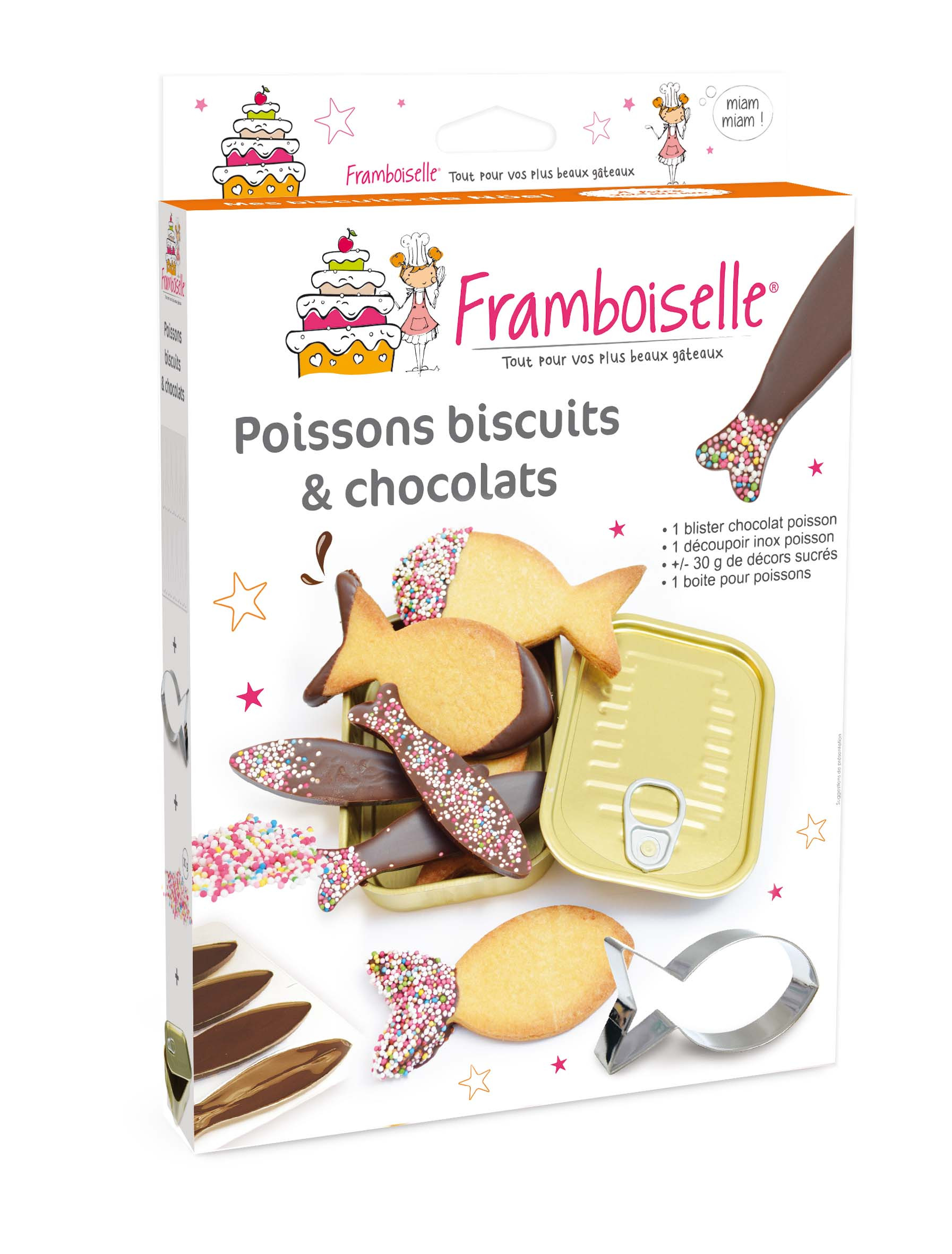 Retrouvez dans ce kit : 1 blister de 10 poissons , 1 découpoir inox poisson, 30 g de décors sucrés et 1 boîte pour poisson en métal.