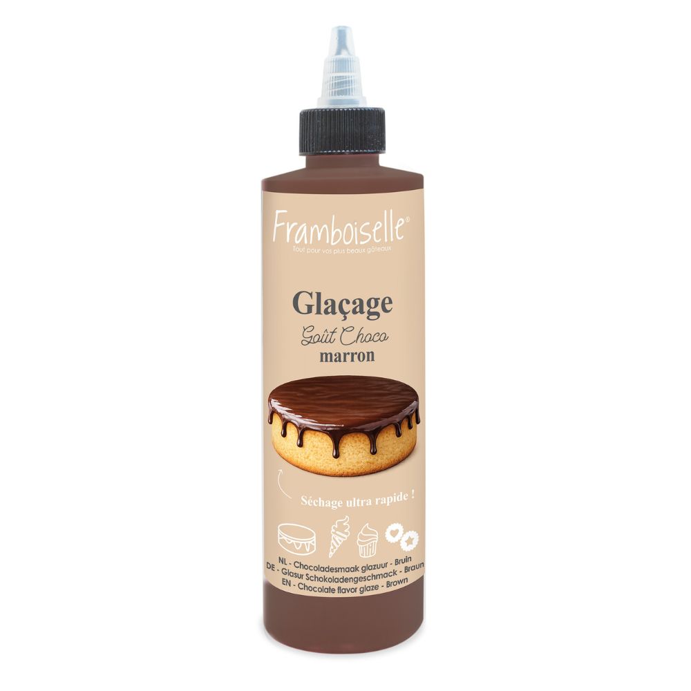 Un flacon de glaçage prêt à l'emploi au goût chocolat de couleur marron. Pour décoration de gâteaux, biscuits, éclairs, cupcakes, entremets et autres pâtisseries.