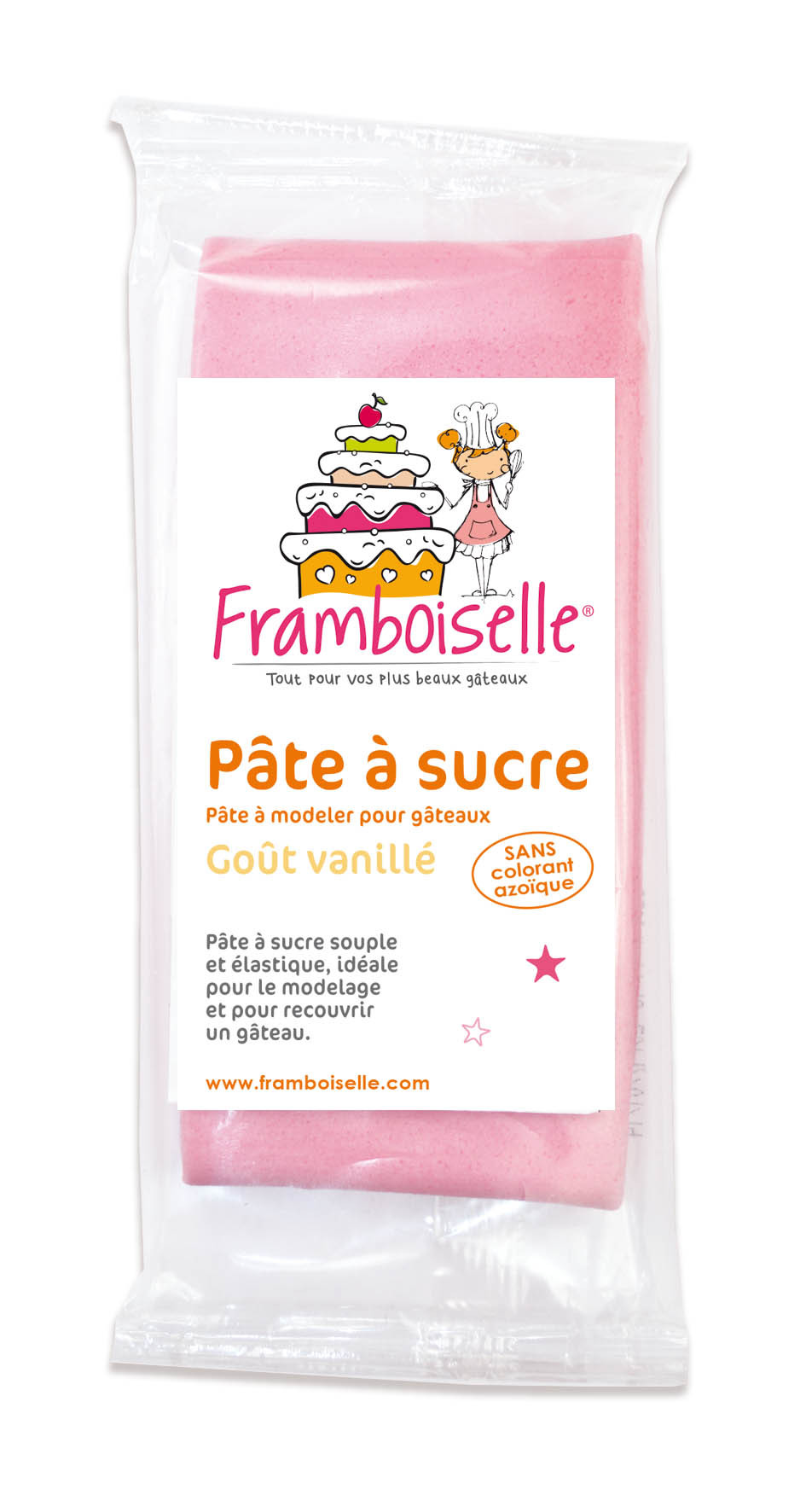 0Idéale pour le cake design, la pâte à sucre rose Framboiselle® est de qualité professionnelle, souple, élastique, elle ne se déchire pas et ne colle pas.